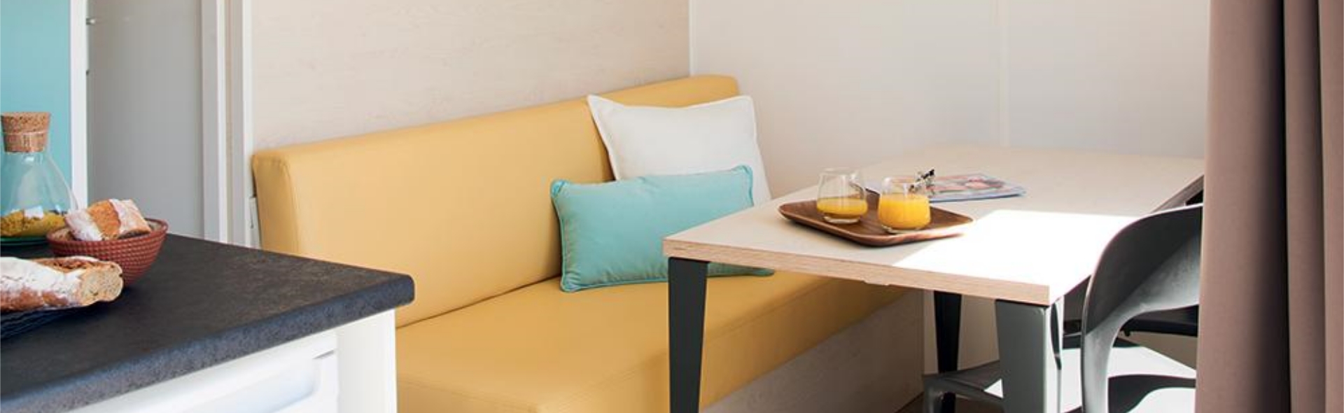 - 1 kitchen-lounge area with fridge, 4 ring hob, sink, crockery, cafetiere, microwave, table, bench and chairs.